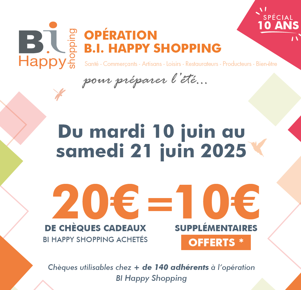 Pour fêter les 10 ans du dispositif, Bièvre Isère lance une opération spéciale ! Du mardi 10 juin au samedi 21 juin 2025, pour 20 € de chèques cadeaux BI Happy Shopping achetés, 10 € supplémentaires sont offerts, (sous forme de chèques cadeaux BI Happy Shopping et dans la limite de 30 € offerts, voir règlement en cliquant sur ce lien).