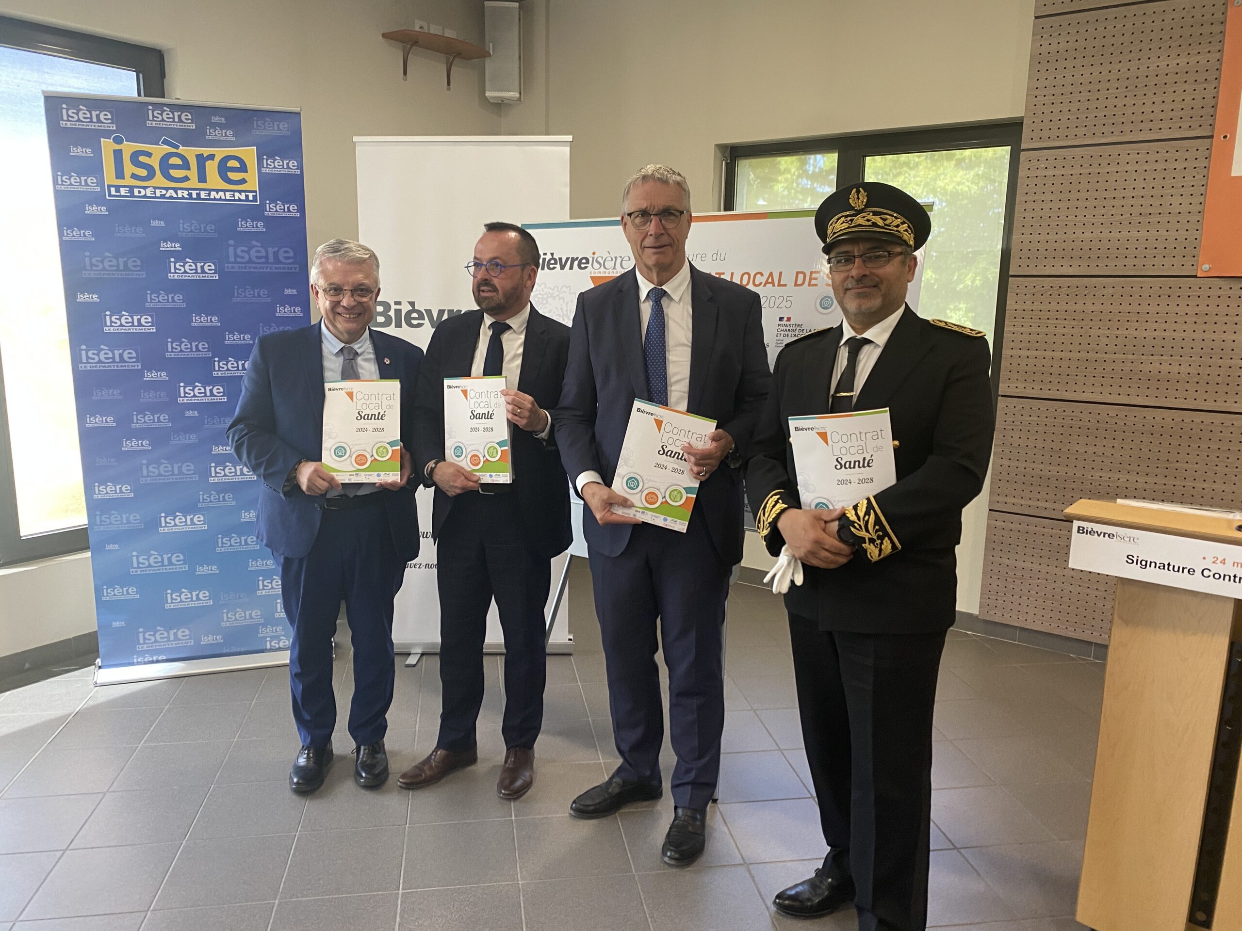 Priorité de la communauté de communes pour répondre aux besoins et aux attentes des habitants du territoire en matière de santé, le Contrat local de santé de Bièvre Isère a été signé samedi 24 mai en présence du Docteur Yannick Neuder, Ministre de la Santé et de l’Accès aux soins, de Sylvie Dézarnaud, Députée de l’Isère, de monsieur Afif Lazrak, directeur de cabinet de la Préfète de l’Isère, de monsieur Jean-Pierre Barbier, Président du Département de l’Isère, de monsieur de Joël Gullon, Président de Bièvre Isère, et de monsieur Loïc Mollet, Directeur départemental de l’Agence régionale de santé, ainsi que des représentants de l’ensemble des partenaires du dispositif.